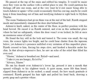 But submission and romance do not work together, this Rizeth knows. Suffering in silence is far better than the alternative. And as for Ashenivir, how can he possibly tell his Master he’s in love with him, when clearly Rizeth doesn’t feel the same?